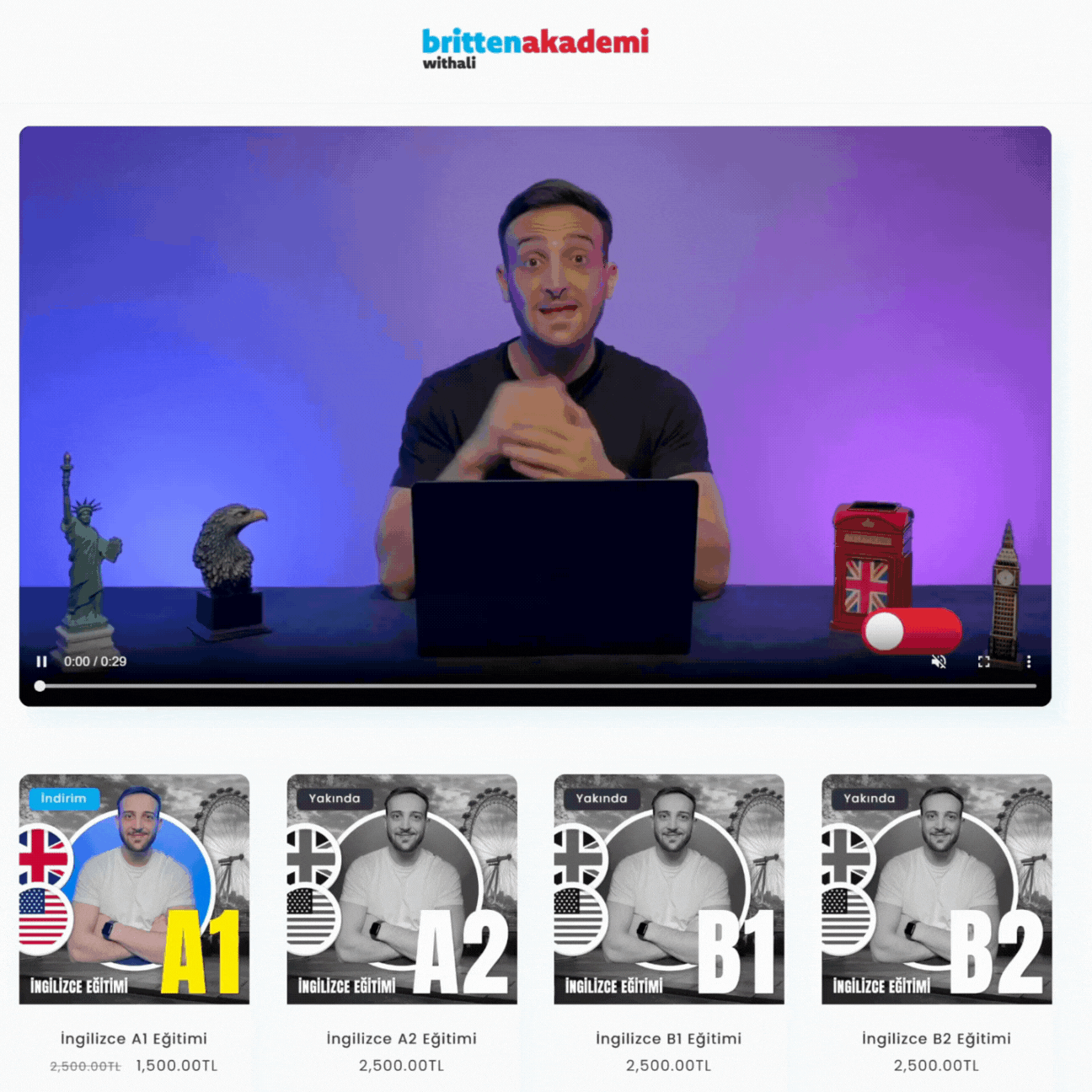 Tanıtım videosunu izle, ihtiyaç duyduğun İngilizce kursunu belirle ve hemen öğrenmeye başla. Eğitim içeriklerini inceleyip tek tıkla sepetinize ekleyebilir veya hemen satın alarak eğitiminize başlayabilirsiniz. İngilizcede kalıcı başarı için doğru yerdesin!