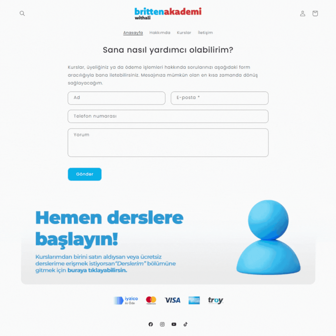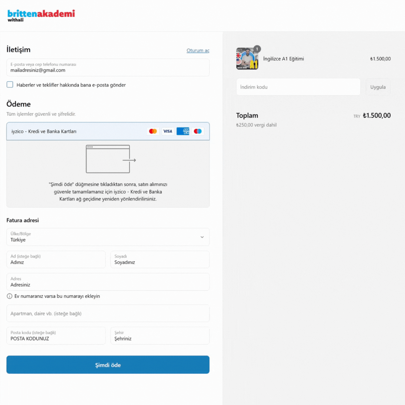 Ödeme işlemi sırasında bir sorunla karşılaşırsanız, lütfen İletişim sayfamızdaki formu kullanarak veya bilgi@brittenakademi.com adresine e-posta göndererek bizimle irtibata geçin. Ekibimiz en kısa sürede sorunu çözmeye yardımcı olacaktır.
